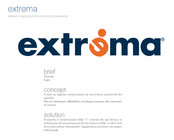 Il marchio è caratterizzato dalla “e” centrale che qui diventa la stilizzazione di una persona su di una sedia a rotelle. I colori ed il lettering rendono riconoscibile l’apparteneza al settore meccanico dell’azienda.