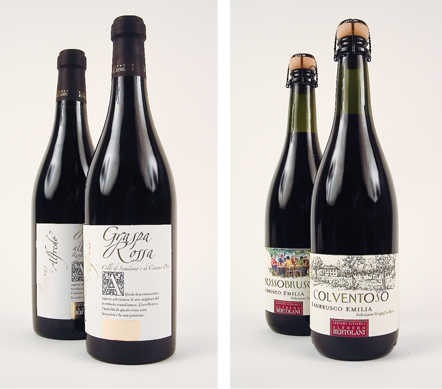 Lambruschi Emilia: le etichette sono decorate da illustrazioni d'epoca di proprietà della famiglia Bertolani che rappresentano i luoghi della storia familiare.