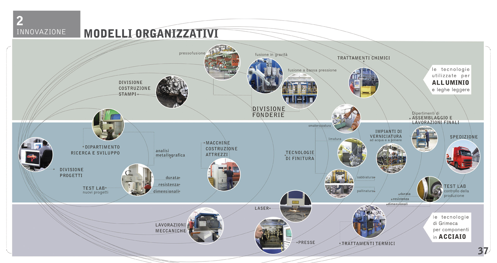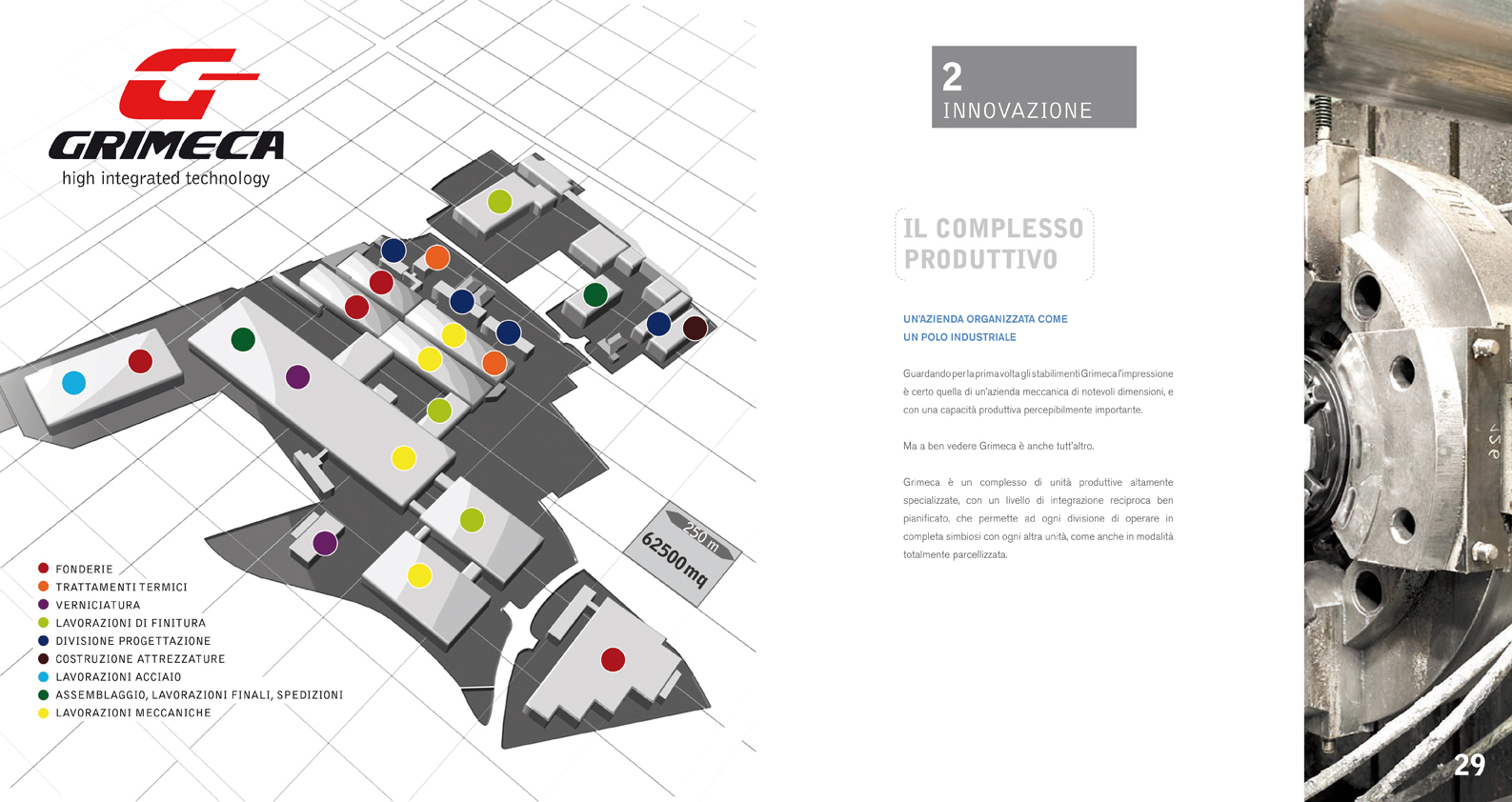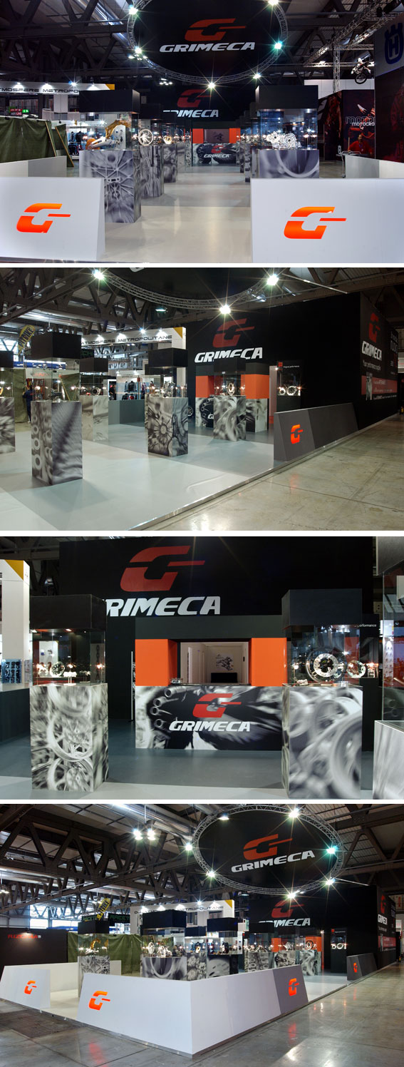 I prodotti Grimeca sono esposti in teche trasparenti, visibili da ogni angolazione. Alla base della teca sono esposte delle fotografie dell'industria Grimeca che rappresentano alcune delle fasi di lavorazione. Il logo, in una logica di politica di marchio, è presente e ben visibile.